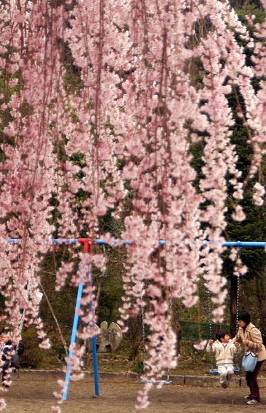 5枚目;宇都宮市城山西小学校、「孝子桜」、南側から枝越しに遊具の親子を。