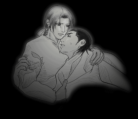 マイエラの夜は深い。石に閉ざされた館に星月の光は漏れ入らず、ましてや僧院中の誰もがそれぞれ分かれて孤独な祈りに過ごす冬至の夜であった。ククールは手の内のわずかな灯火を頼りに細い通路を歩いてゆく。古い暦の定める通り粗い毛織の衣を身に纏い、足はただ素足で。燭台の炎は歩みにつれ頼りなく揺れて、暗黒は不定形の獣に似て耳元に息づくようだ。それともそう思わせたのはただ胸のうちに抱えた心の暗さであったのか。 心。こんなものはなくなってしまえばいいとククールは願い続けてきた。荒れ狂う嵐がこの三年というもの絶え間なくそこにあって、朝晩の祈りも信仰も鎮めることはできない。子供らしい盲従が剥がれ落ちて、隠されていた愛憎がとりかえしもつかない形であらわになったその日からこのかた。 奇妙なことに、ククールはこのとき暗い心のほか粗悪なナイフを衣の下に持っていた。それはもとより決意ではなく殺意でもなく、この夜は騎士団長の栄位にある兄マルチェロも一人きりだと思い至った瞬間に、たまさか手の中にあったというそれだけのことに過ぎない。だが長い闇を歩むにつれ、懐に抱いた鋼は次第に重くまた暗く、心にのしかかる気配であった。 このナイフで俺はあいつを殺すだろうか、とククールは考える。その心臓に鋼を刺し驚愕にゆがむ顔を見下ろすだろうか、流れ出す血の温度と冷えてゆく体のうつろな顔を知るだろうか、と。闇を行く歩みの中で、それは息が詰まるほど魅惑的な夢想であった。死んだ兄は拒絶を示さないだろう。死んだ兄はこの視線に気づいても軽蔑やそれよりも冷酷な無視の身振りをしないだろう。死んだ兄は口付けすることができるだろう。死んだ兄ならば。 修道院と中州の小島をつなぐ川底の通路の永い行程を経て、ククールは再び地上に立った。この夜に騎士団長の宿る石のあずまやは、星空を丸屋根の形に切り取って闇に佇んでいる。熱病に浮かされたもののよう、寒さも覚えずただ歩み進めば、狂気のごとく灯火は揺らいだ。 石の戸口をくぐり心臓の鼓動に追い立てられて見回した目は、石の壁にうずくまる影を見出した。それだけではや怯み始めた思いを落ち着かせようとククールは懐のナイフを衣の上から握り締めた。同じ毛織の衣を着込んだ兄は背を丸めて壁に身をもたせかけ、深い眠りのさなかにあるとみえた。 誇り高い青衣の騎士団長を見慣れた目に、それは奇妙な眺めであった。頭を垂れて眠るマルチェロは昼間の記憶より幾分か若く、そして無力に見える。そうだ、無力に。蛇のように音もなく歩み寄って、ククールは兄を見下ろした。思い描いたどんな状況よりも整ったおぜん立てだった。今なら殺すにたやすいと思われた。そうだ、眠りのうちなら苦しみも少ないはず。 ほとんど息もできずに立ち尽くした数秒の後、ククールは膝をついた。間近に見るマルチェロの顔は寒さに色を失い、息があるのかさえ疑わしい。思わず触れようと伸ばした手の先で、かすかに吐息が乱れた。鋼を抜き出しかけていた左手を止めて様子をうかがえば、身じろぎの気配とともに要領を得ぬかすかな囁きが耳に届く。 「……ッ――」 押し殺した悲鳴が聞こえたと同時に、引くこともできずにいた腕をつかまれた。あまりの驚きに取り落とした灯火は音さえ残さず消えて、後には闇。鼓動が、とククールは考える。鼓動がうるさすぎて。俺はどうしたら。どう――したら。 ひどくつたない動作ですがられた。どうすることもできずに抱き寄せる。腕の中の身体から発する呼吸は浅く速く苦しげで、薄い汗の香さえ漂う。悪夢にうなされ目覚めることもままならぬ兄をどうして殺せよう。 「……どうすればあんたを救える」 ククールは囁いた。愛しもし憎みもし恨みもし殺したいと望みもしたが、結局のところ、自分は地獄の中を奈落に向かってひたすらに沈み進む兄の魂を救いたいだけだった。どれほど切に願っても、その手立てはないというのに。そうだ、その手立てだけがない。どこにもない。 どうか神さま、とククールは心から祈った。兄貴を救ってください。兄貴を救ってください。俺には救えない。 *画像の著作権はTSさんに帰属します。またこの物語は、TSさんの絵から発想されました。掲載の許可を下さったことに深く感謝いたします/太郎飴 |